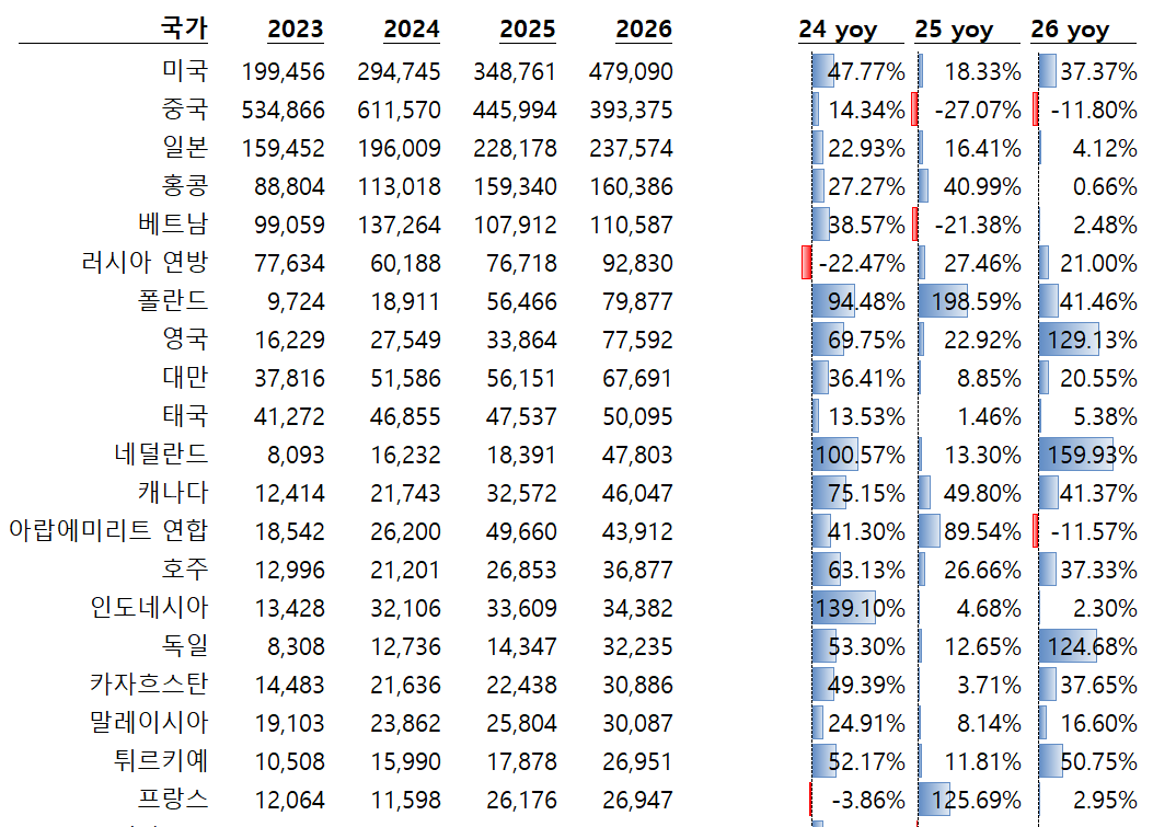 2026년 성장에서 가장 눈에 띄는 국가들은 영국, 네덜란드, 독일, 튀르키예 등 유럽권 국가입니다. 유럽 유통의 허브인 폴란드도 41.5%나 성장했습니다.