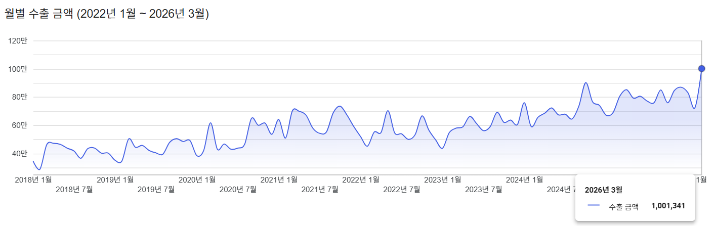 2026년 3월 한국 화장품 수출 금액이 10억 달러(약 1.5조 원)를 돌파하며 전고점을 갱신했습니다.