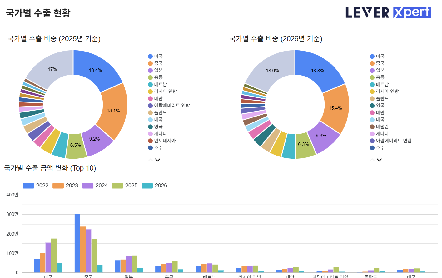 국가별로 화장품 수출 현황을 알아보는 것은 한국 화장품 시장의 성장을 전망하고 핵심 타겟 지역을 선정하는 과정에서 필수적입니다. 레버 엑스퍼트 팀은 뷰티 고객사를 위해 관세청 수출입무역통계 데이터를 지속 추적 업데이트하고 있으며, 대시보드를 통해 상시 접근이 가능합니다.
