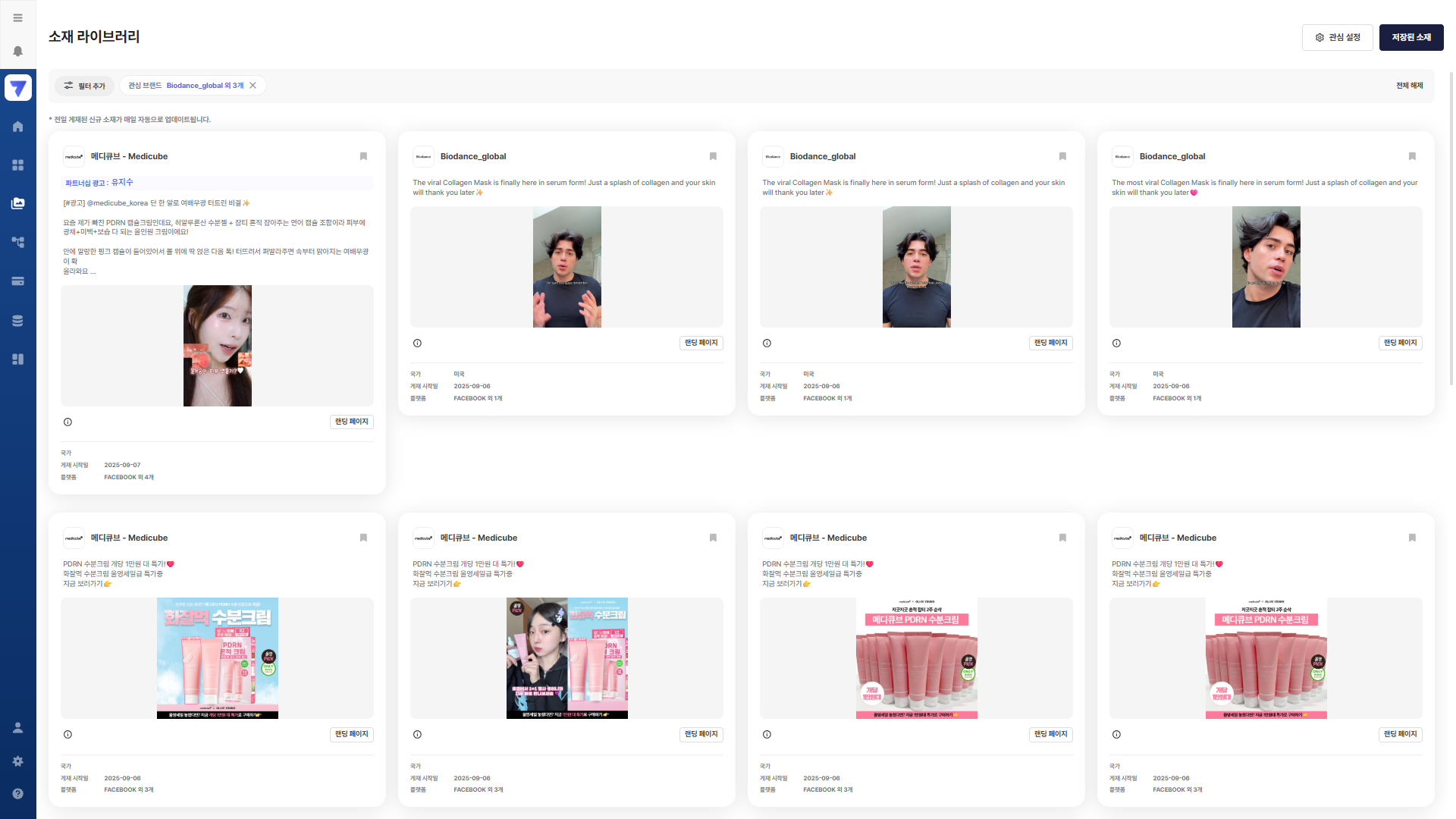 레버 엑스퍼트의 소재 라이브러리 기능은 벤치마킹에 최적화된 기능입니다. 페이스북 광고 라이브러리 기능은 유용하지만 휘발된다는 점과 여러 브랜드를 동시에 관리할 수 없다는 사용 상의 불편함이 있는데, 레버 엑스퍼트 기능을 활용하면 여러 브랜드를 동시에 보고 지속 적재할 수 있을 뿐만 아니라 원하는 소재를 별도 폴더에 저장하여 언제든지 기획 및 제작에 활용할 수 있다는 강점이 있습니다.