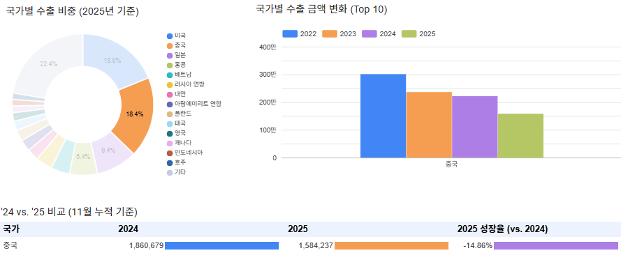 기존 1위 수출국이었던 중국은 2025년 미국에 그 자리를 내주었는데요, 고점을 기록했던 2021년 이후 지속 하락하고 있는 추세이며 2025년에도 하락 추이는 여전해 보입니다.