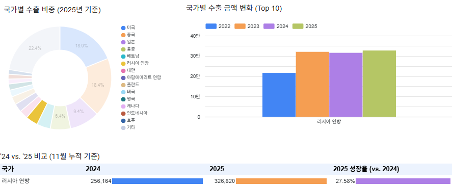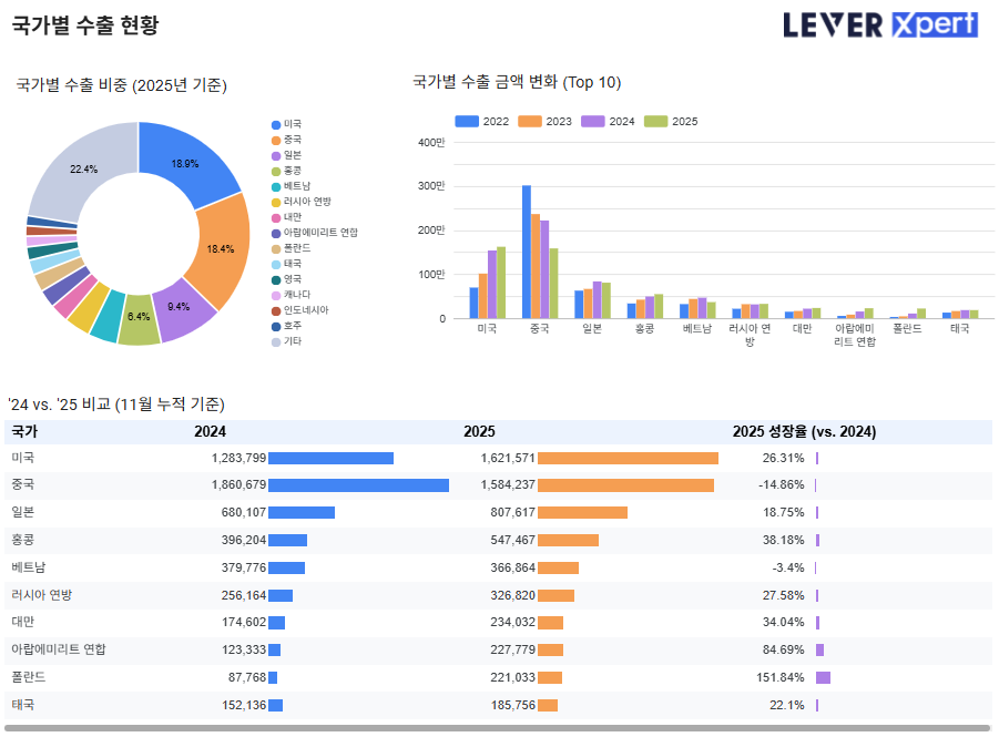 연도별 수출 금액 추이를 보게되면 2023년 급성장하여 2024년에는 성장이 잠시 둔화되었으나, 2025년 11월 누적 기준으로 전년 대비 27.6% 성장하여 이미 2024년 수출 금액을 돌파했습니다.