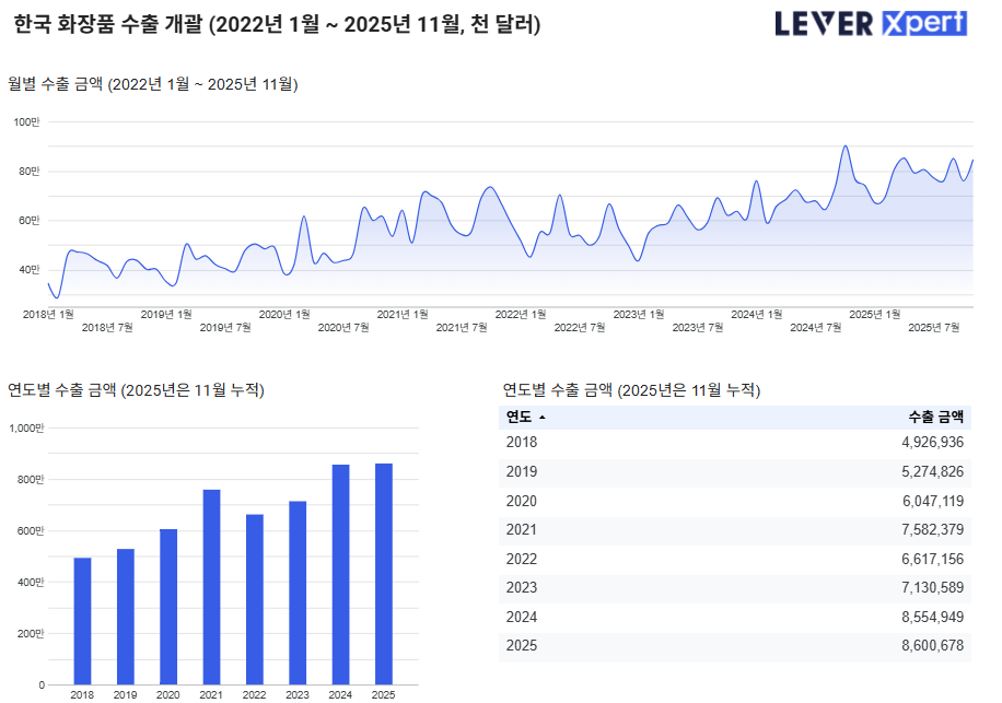 한국 화장품 수출 현황 및 추이 대시보드 배포 (11월 업데이트)
