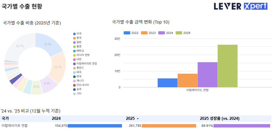 지역 순위로 보면 폴란드 바로 위인 8위인데, 전년 대비 70% 가량 성장하여 2025년 총 2.6억 달러의 수출 규모를 기록하였습니다.