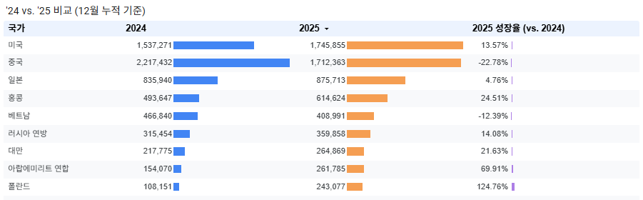 1위였던 중국은 전년 대비 23%나 감소하였고, 베트남은 2024년과 2025년 모두 5위를 기록했지만 전년 대비 12% 감소하였습니다.
