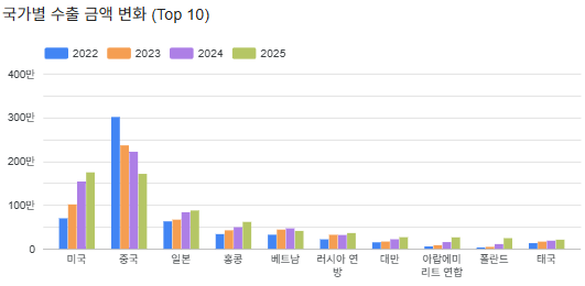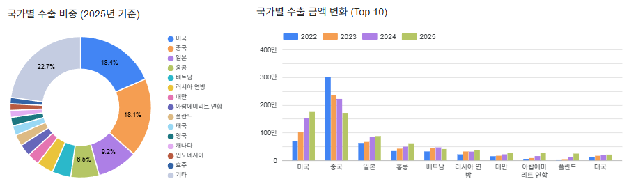 2024년까지 2위를 차지하던 미국은 2025년 기준으로 중국향 수출 규모를 역전했습니다.