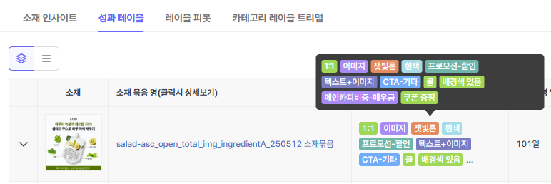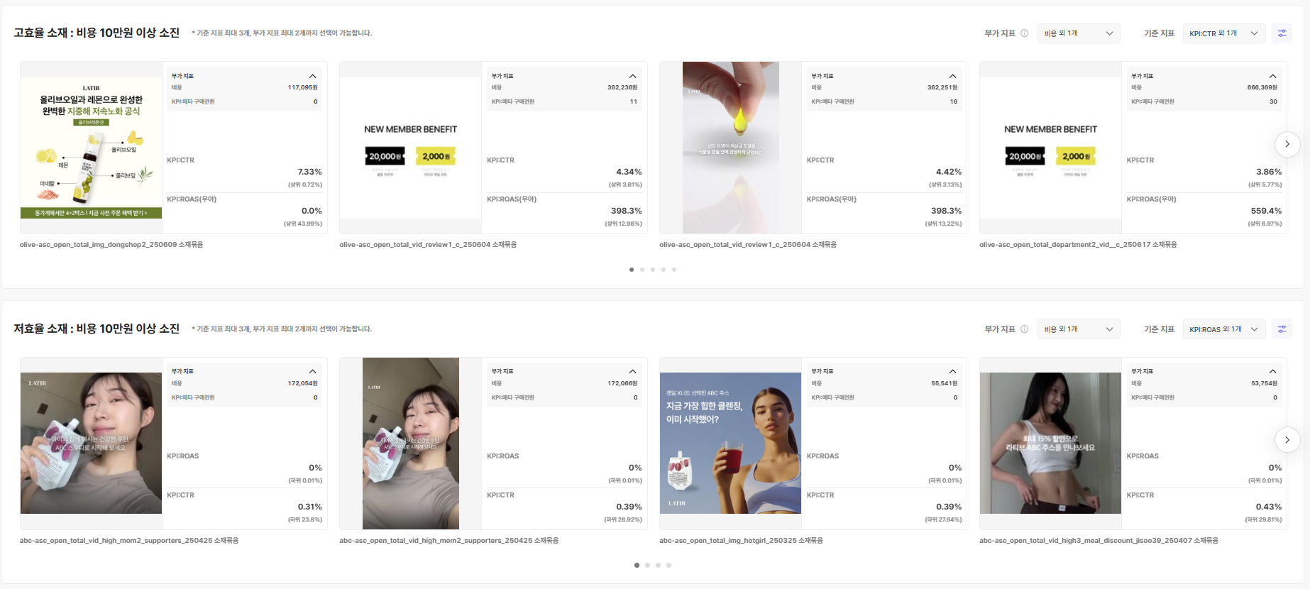 고효율 소재 공식을 찾기 위해서는 이러한 다양한 특성들을 광고 성과와 결합하여 다양한 각도의 필터링을 거쳐 발굴해야 합니다. 브랜드마다, 시기마다 중요하게 보는 광고 지표나 기준이 되는 광고비는 달라질 수 있기 때문에 상황에 맞게 적용할 수 있어야 합니다.