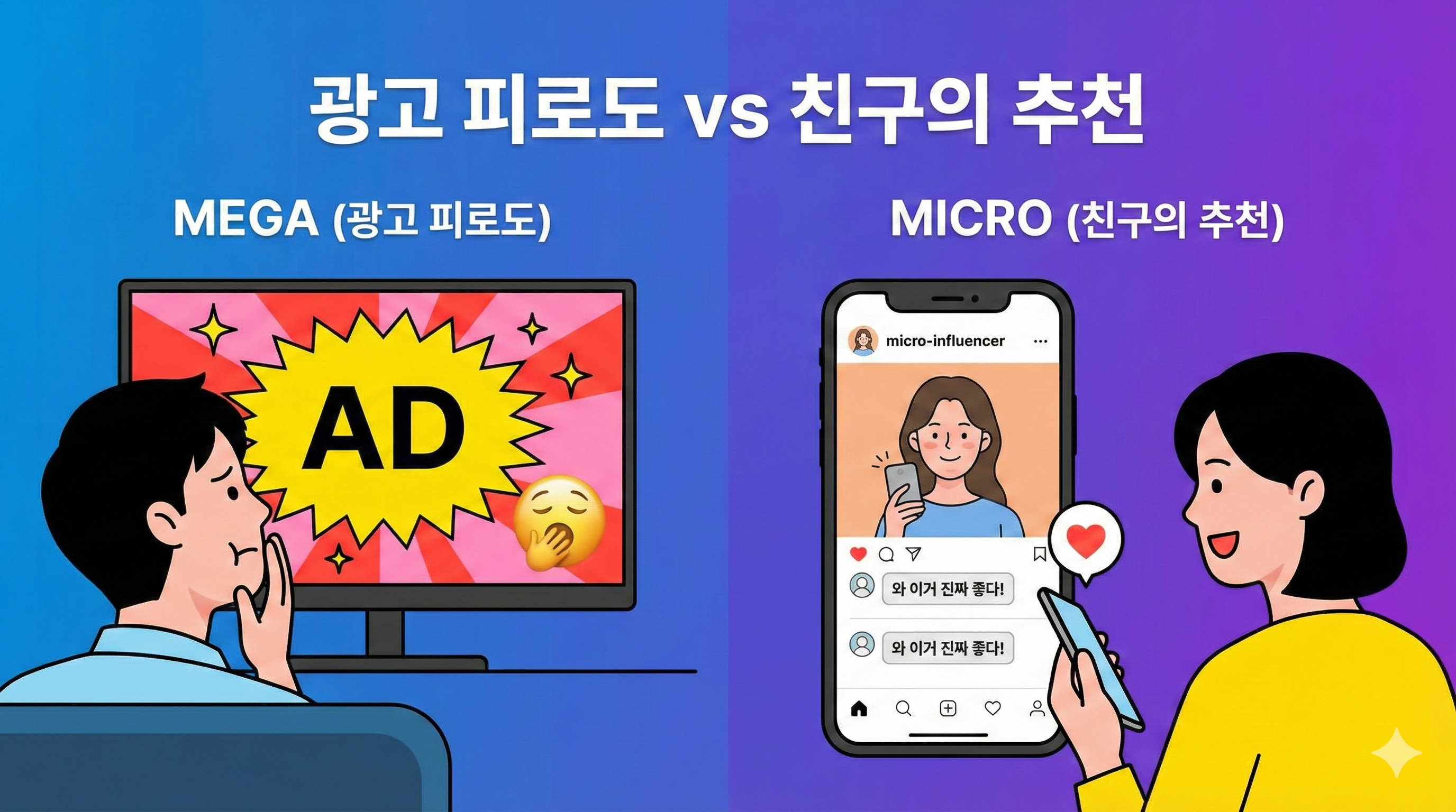 B. 광고 피로도(Ad Fatigue)의 증가: 소비자들은 연예인급 메가 인플루언서의 광고를 'TV CF'처럼 인식하고 무시하는 경향이 강해졌습니다. 반면, 나와 비슷한 라이프스타일을 공유하는 마이크로 인플루언서의 추천은 '친구의 제안'으로 받아들입니다.