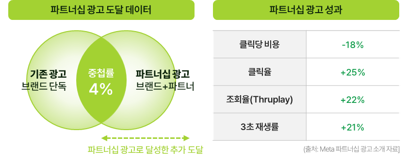 이처럼 진정성있는 콘텐츠는 광고 저항을 낮추고 자연스러운 참여를 유도하는데요. 실제로 메타에 따르면 파트너십 광고는 기존 광고 대비 CPC가 약 18% 낮고, 클릭·조회·재생률은 20% 이상 높은 성과를 보이는 것으로 나타났습니다.