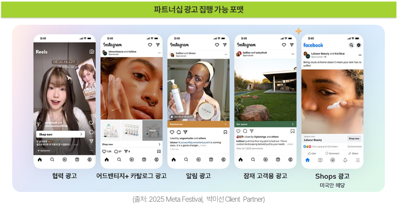 또한 파트너십 광고는 특정 광고 유형만 지원하는 별도의 상품이 아니라, 기존 메타 광고 포맷에 크리에이터 협업 구조를 결합한 형태라고 이해하면 되는데요. 즉, 일반 광고 캠페인에서 사용하던 대부분의 포맷을 그대로 활용하면서 크리에이터 콘텐츠를 광고 소재로 사용할 수 있는 구조입니다. 이러한 구조 덕분에 파트너십 광고는 일반 브랜드 광고보다 더 자연스럽게 피드 콘텐츠처럼 노출되는 특징을 갖습니다.