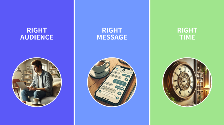 마케팅을 잘하기 위한 핵심 원칙 3가지를 RIGHT AUDIENCE, RIGHT MESSAGE, RIGHT TIME 이라고 합니다. 우리의 제품/서비스가 도달하고자 하는 고객에게, 그들에게 소구할 수 있는 메시지를, 최적의 타이밍에 전달하는 것입니다.