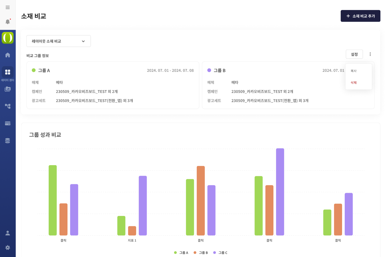 소재 분석은 네이버, 카카오모먼트, Meta, Google 4개 매체 뿐만 아니라 Tiktok까지 최근 확장되었으며, A/B 테스트에 필요한 소재 비교 기능도 곧 만나보실 수 있습니다.