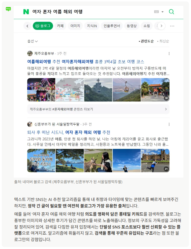 이와 달리 블로그는 여전히 검색 중심의 노출 구조에 의존합니다. 사용자가 검색하지 않으면 콘텐츠를 마주칠 기회가 거의 없고, AI 추천 기반의 피드나 관심사 큐레이션 기능은 부재에 가깝습니다. 따라서 플랫폼 내 콘텐츠 소비 흐름이 느리고 제한적이며, 콘텐츠 생산자도 ‘누군가가 검색해줘야만 의미가 생기는’ 구조에 갇히게 되는 것이죠. 이는 확산 가능성을 결정적으로 떨어뜨리는 요소입니다.