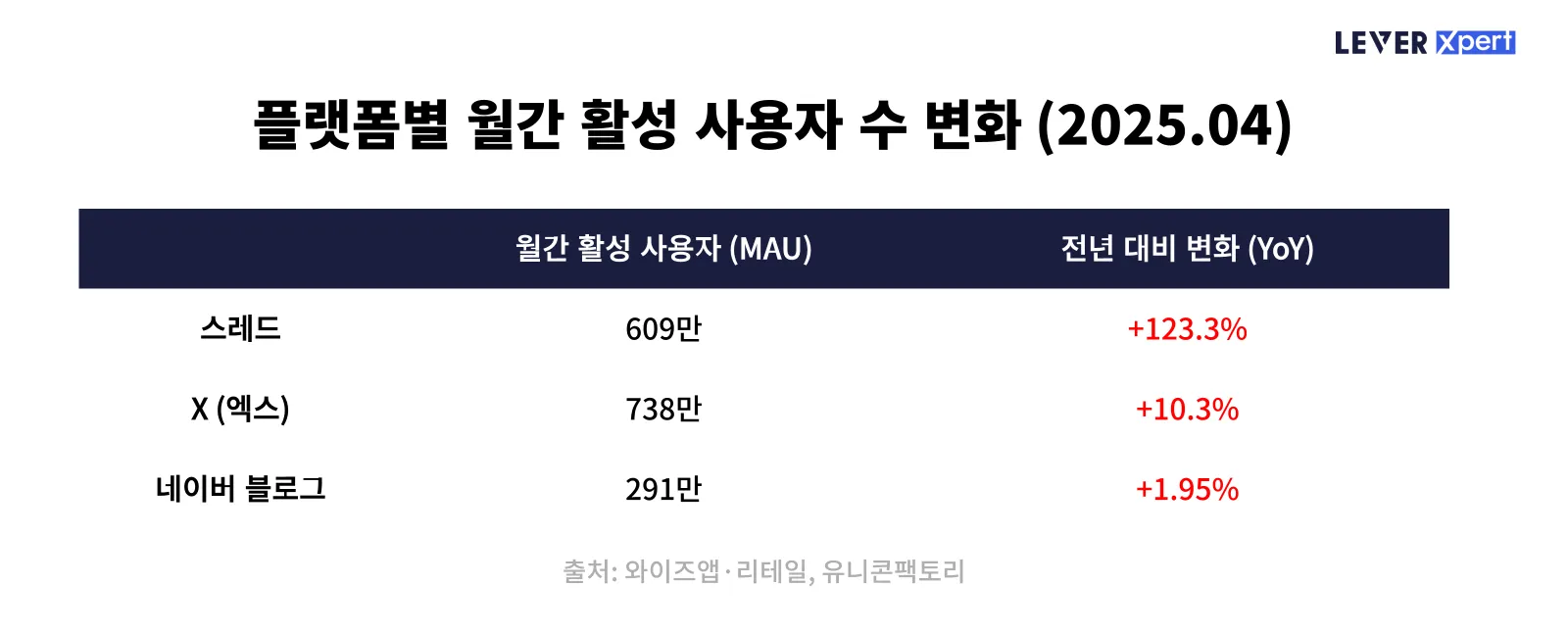 스레드는 1년 사이 월간 활성 사용자 수가 123.3% 증가하며 폭발적인 성장세를 기록하고 있는데, 이는 신규 플랫폼이지만 모바일 네이티브 세대를 중심으로 빠르게 확산되고 있음을 보여줍니다.