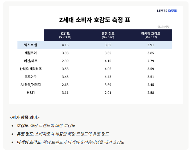 실제로 캐릿이 진행한 소비자 호감도 조사에 따르면, 텍스트힙은 Z세대에게 ‘호감도 4.15점, 유행 체감 3.66점, 마케팅 호감도 3.91점’ (5점 만점 기준)을 기록하며 단순한 취향을 넘어 콘텐츠 전략과 마케팅 채널로서도 충분한 매력을 입증하고 있습니다.