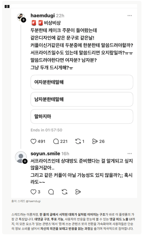 성장하는 텍스트 플랫폼은 공통적으로 사용자 간의 소통을 콘텐츠로 만듭니다. 스레드와 X는 글에 댓글을 다는 것을 넘어서, 인용글, 멘션, 리트윗 등으로 반응 자체를 하나의 콘텐츠로 전환할 수 있게 설계돼 있는데요. 즉, 텍스트는 단순히 발신자에서 수신자로 흘러가는 정보가 아니라, 플랫폼 내에서 끊임없이 이어지고 증폭되는 대화의 단위가 됩니다. 이런 참여 기반 구조는 알고리즘 노출을 더 자극하고, 콘텐츠 수명을 자연스럽게 연장시켜 줍니다.