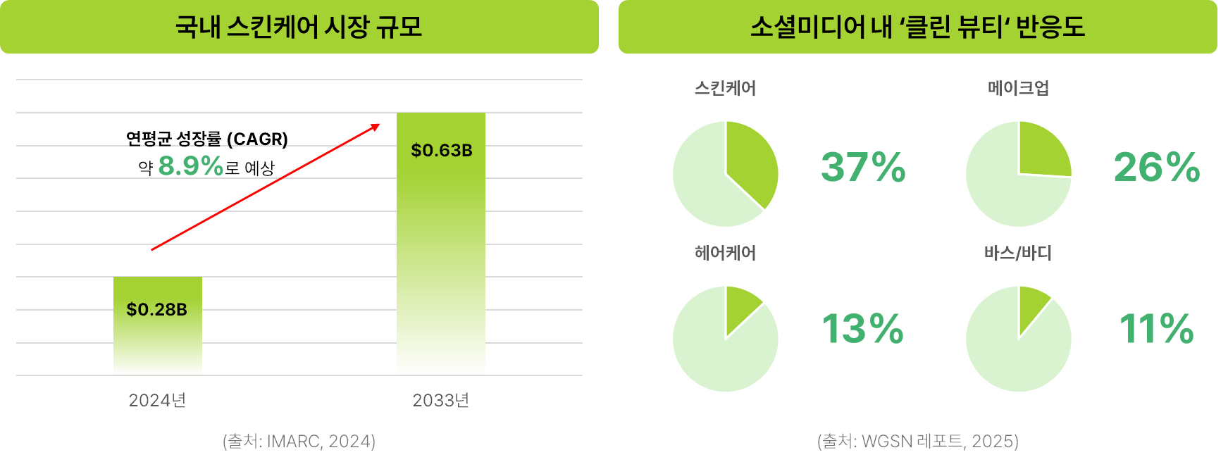 국내 기초 화장품 및 스킨케어 시장은 꾸준한 성장세를 이어가고 있습니다. 시장 조사에 따르면 해당 시장 규모는 2024년 약 2억 7,996만 달러로 평가되었으며, 2033년에는 약 6억 303만 달러 수준까지 확대될 것으로 전망되는데요. 이는 2025년부터 2033년까지 연평균 약 8.9%의 성장률(CAGR)을 기록할 것으로 예상되는 수치입니다. 최근 소셜미디어 반응 데이터를 살펴보면 클린 뷰티에 대한 관심이 특히 증가하고 있으며, 관련 논의 중에서도 스킨케어 카테고리가 약 37%로 가장 높은 비중을 차지하는 것으로 나타났습니다.