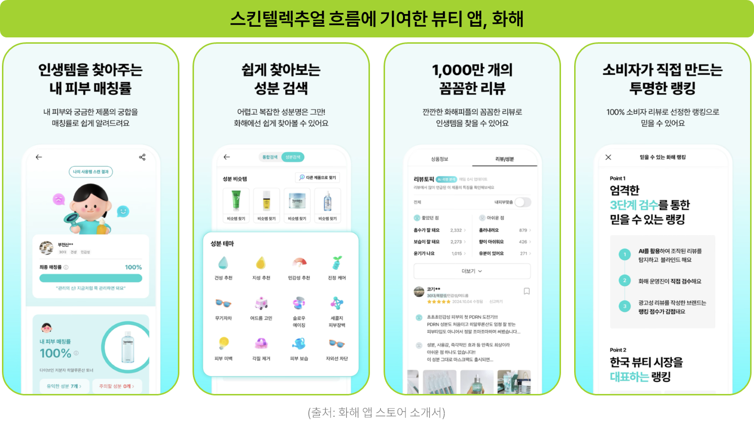 이 흐름을 가속화한 대표적인 사례가 바로 뷰티 앱, “화해”입니다. 화해는 수십만 개 이상의 제품 전성분을 데이터베이스화하고, 난해한 성분명을 소비자 언어로 번역해 제공해 왔으며, 여기에 리뷰와 랭킹, 검색 데이터를 결합하면서 성분 중심의 탐색 경험을 일상화했죠. 최근 발표된 2026 뷰티 트렌드 리포트에서도 고기능 미니멀리즘, 안심 진정 뷰티와 같은 키워드가 특정 성분과 함께 제시되고 있는데, 이는 국내 소비자가 이미 ‘성분 리터러시’를 갖춘 단계에 진입했음을 보여주는 지표이기도 합니다.