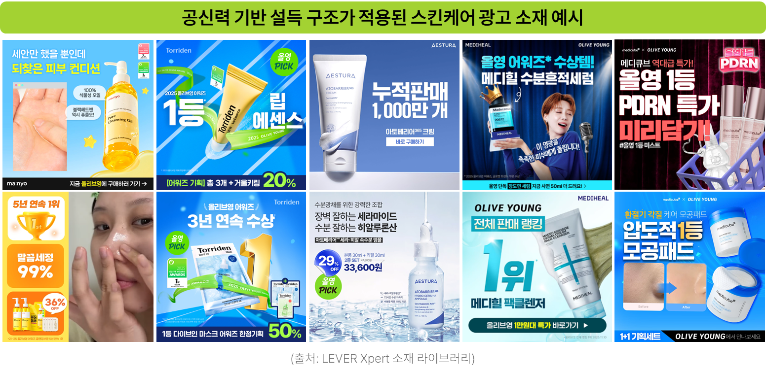 그중 하나가 바로 ‘공신력 기반 설득 구조’ 인데요. 상위권 브랜드들의 광고 소재를 살펴보면 감도 중심의 무드 연출보다는 효능과 검증 데이터를 전면에 배치하는 경향이 매우 강했습니다. 임상 시험 수치나 사용 기간별 개선 데이터를 명확하게 제시하고, 올리브영 랭킹이나 어워드 수상 이력, 누적 판매량과 같은 채널 기반의 사회적 증거를 함께 반복적으로 드러낸 것이죠.