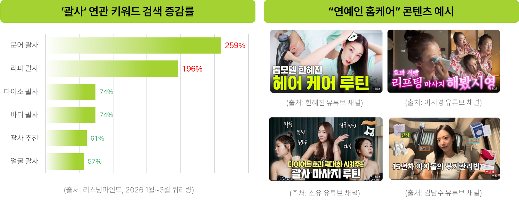 유튜브와 틱톡 같은 플랫폼에서는 괄사를 활용한 셀프 마사지나 승모근 관리 방법, 두피 마사지 방법을 소개하는 콘텐츠가 꾸준히 확산되고 있는데요. 연예인들의 전유물로 여겨졌던 에스테틱 관리가 사실은 생각보다 간단한 방법으로도 실천할 수 있다는 점이 강조되면서, 많은 소비자들이 “나도 해볼 수 있겠다”는 인식을 갖게 된 것이죠. 실제로 연예인 홈케어를 전면에 내세운 영상 콘텐츠들은 그들이 사용하는 제품에 대한 신뢰도를 증대시키고, 이러한 기대는 자연스럽게 실제 행동으로 이어지게 만드는 동력으로 작용합니다.
