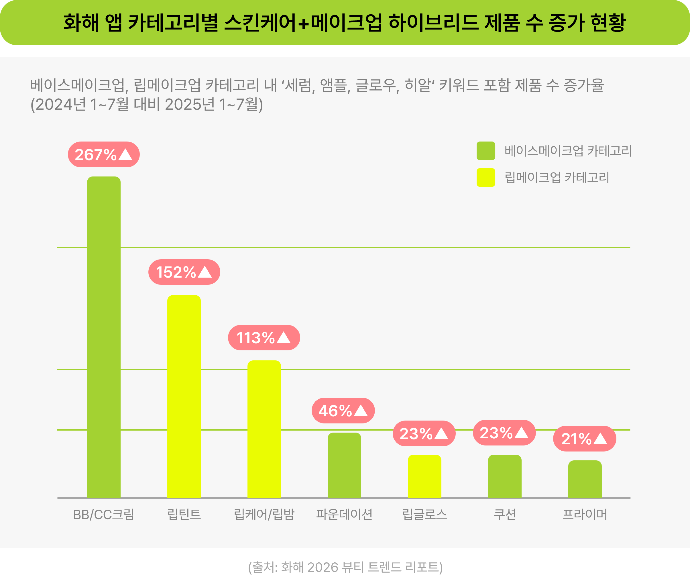 화해 앱 데이터에 따르면 '세럼, 앰플, 글로우, 히알' 키워드가 포함된 메이크업 제품이 전 카테고리에서 증가했다고 합니다. 특히 BB/CC크림(267%), 립틴트(152%), 립케어·립밤(113%) 순으로 급증해, 베이스와 립 시장의 변화가 뚜렷하게 확인됩니다.