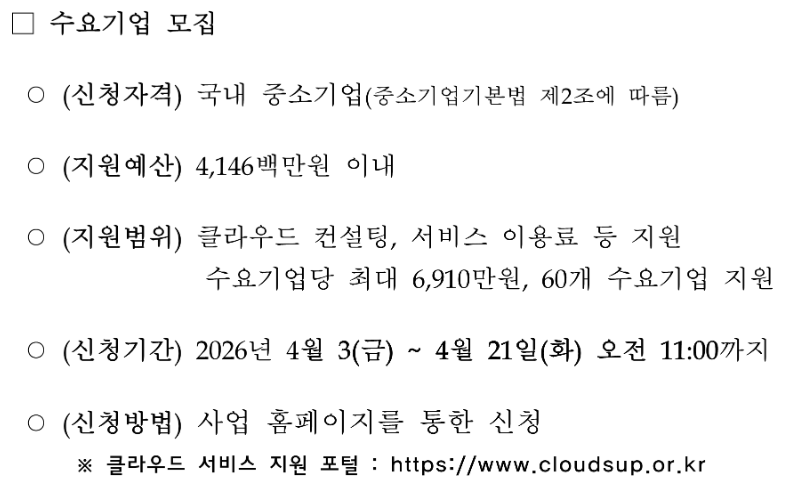 2026 클라우드 바우처 수요 기업 신청 기간 및 주요 서류