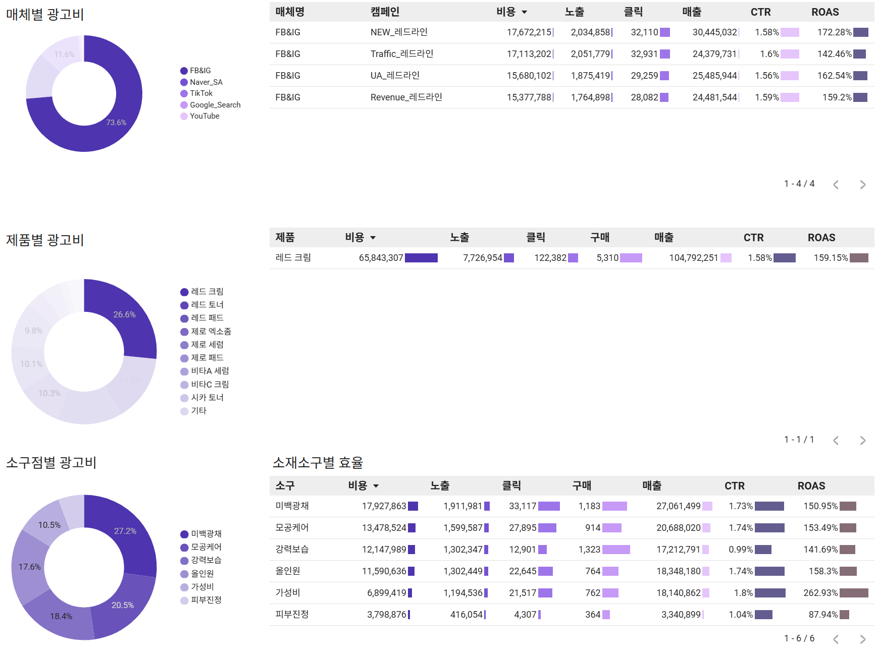 특히 중요한 건 다변수 분석입니다. 위 예시 이미지는 매체x제품x소구점 분석을 담고 있는데, 다른 소구 대비 '가성비' 항목이 높은 ROAS를 기록하고 있습니다. 앞으로 '레드 크림' 제품의 광고 소재를 만들 때는 '가성비'를 강조한 소재들을 많이 활용하는 것이 전체 광고 효율 개선에 영향을 줄 것으로 보입니다. 이처럼 각 매체, 상품마다 최적화된 소구점이나 소재 유형이 있을 수 있기 때문에 이 과정을 통해 고효율 요인을 정의할 수 있습니다.