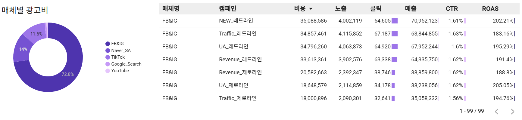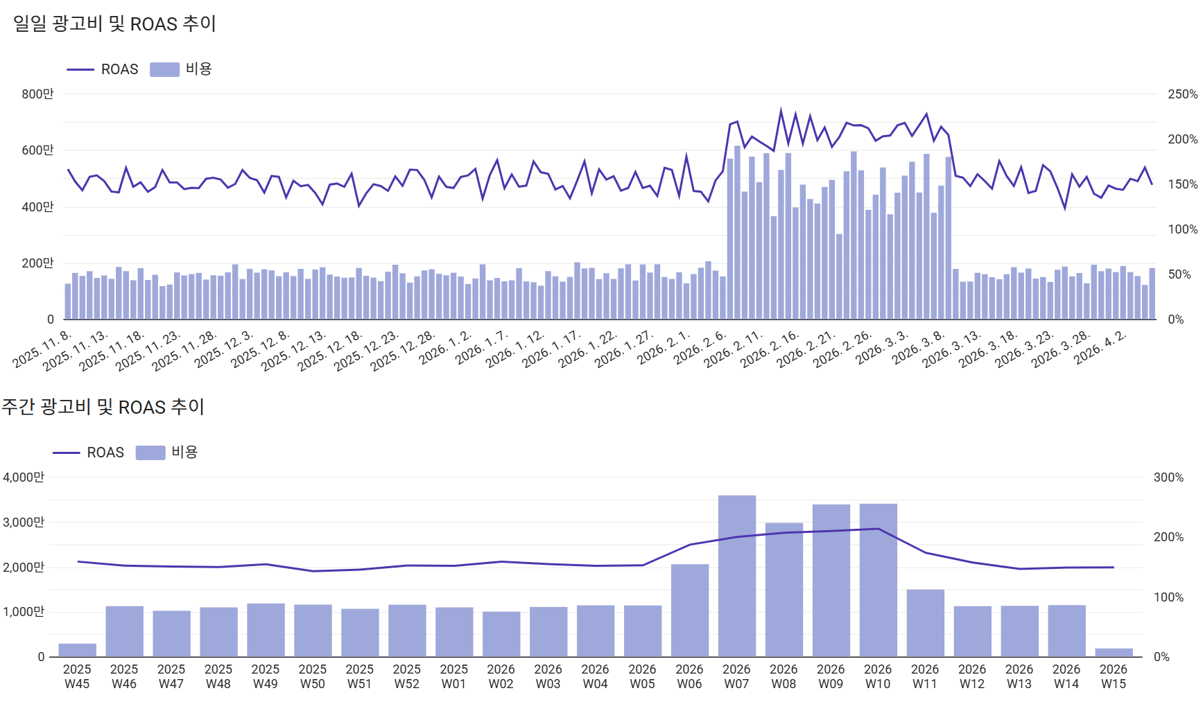 현황 파악은 위 예시 그래프를 기준으로 핵심 지표, 즉 KPI가 전일/전주/전월 대비 얼마만큼 변화하였는지 추이를 파악하는 것입니다. 브랜드의 경우 일별/주별/월별 광고비에 따라 핵심 지표인 매출과 ROAS가 어떻게 변화했는지 파악함으로써 앞으로 사용할 예산 규모를 가늠해볼 수 있습니다.