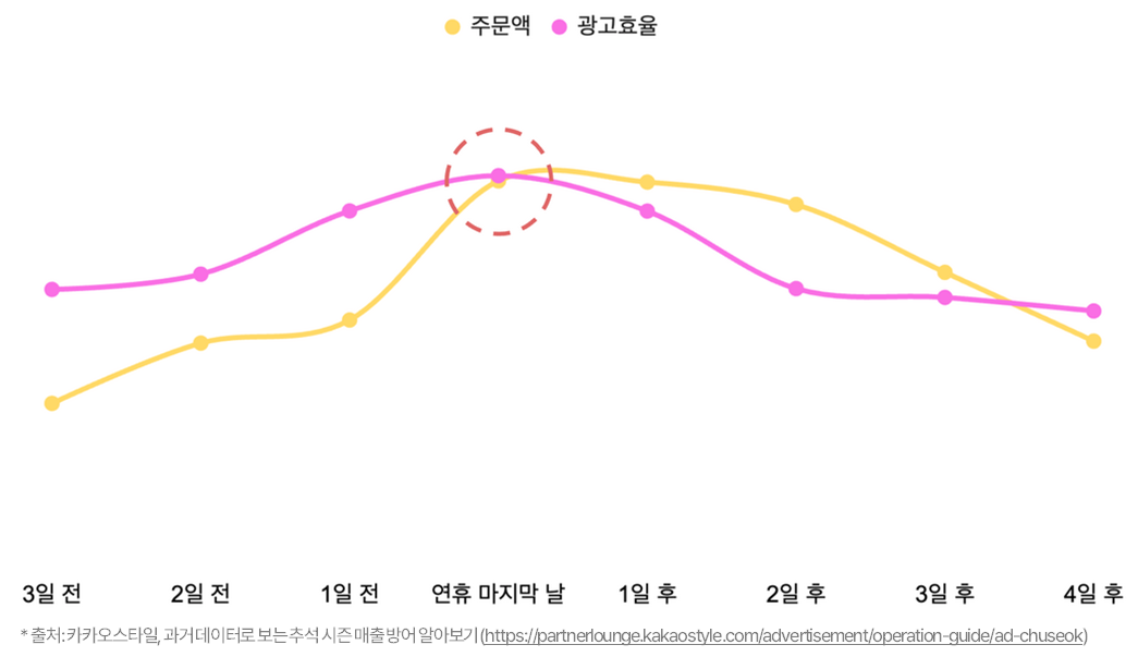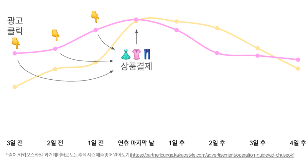 예를 들어, 연휴 기간에는 택배사 배송 업무가 중단되면서 배송 기간이 길어질 수밖에 없습니다. 자연스럽게 소비자들은 결제를 주저하게 되고, 주문량 역시 줄어드는 것이죠. 지난해 카카오스타일에서 배포한 자료에 따르면, 추석 기간 매출액은 하락하는 모습을 보였는데요. 흥미로운 점은, 연휴 마지막 3일 전부터 1일 전까지는 광고 효율이 주문액보다 높게 나타났다는 점입니다.