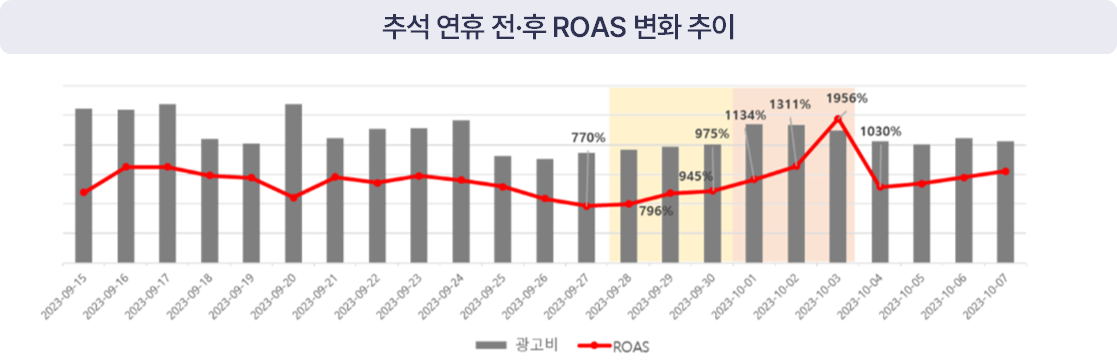 실제로 내부 사례에서도 비슷한 결과가 나타났습니다. A사의 추석 연휴 전·후 ROAS 변화를 살펴보면, 연휴 전 평일(월~수)에는 하락세를 보이다가 연휴 첫날에는 비슷한 수준으로 회복 → 이후 연휴가 진행되며 점차 개선 → 마지막 날 최고치 기록이라는 흐름을 보였습니다.