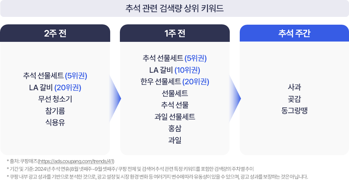 추석 시즌은 ‘선물세트’ 관련 수요가 집중적으로 늘어나는 시기이기도 합니다. 쿠팡애즈에서 정리한 자료에 따르면 추석 2주 전부터 ‘추석 선물 세트’ 키워드가 상위 5위권에 진입했고, 1주 전에는 LA갈비/한우 선물세트 등 구체적인 상품 키워드가 급상승했습니다. 따라서, 추석 관련 제품을 운영 중이라면 최소 2주 전부터 집중 운영하는 것이 성과에 유리합니다.
