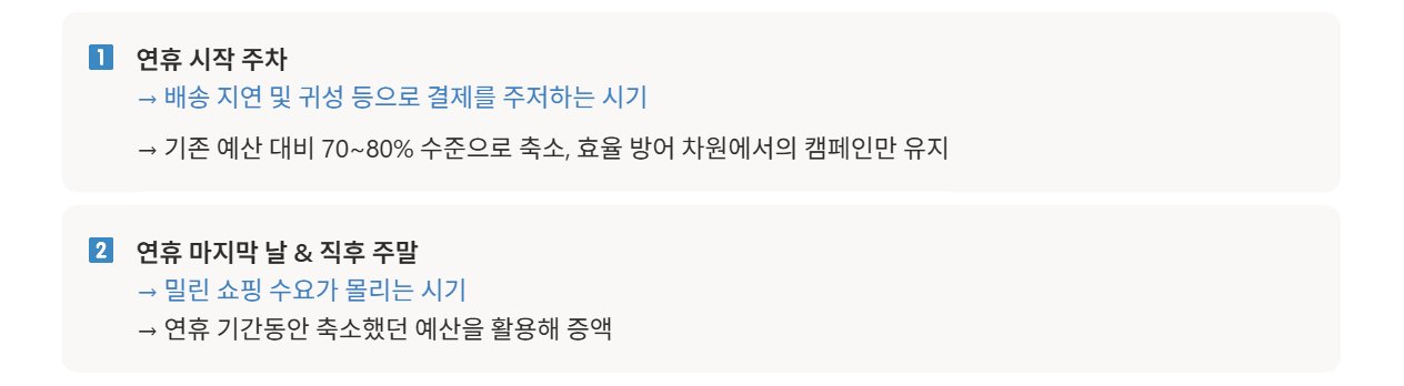 결국 중요한 점은, 유저들의 탐색 활동은 연휴 내내 이어진다는 겁니다. 따라서 광고를 OFF하기보다는 예산과 소재를 조정하며 성과를 방어하는 전략이 필요합니다.