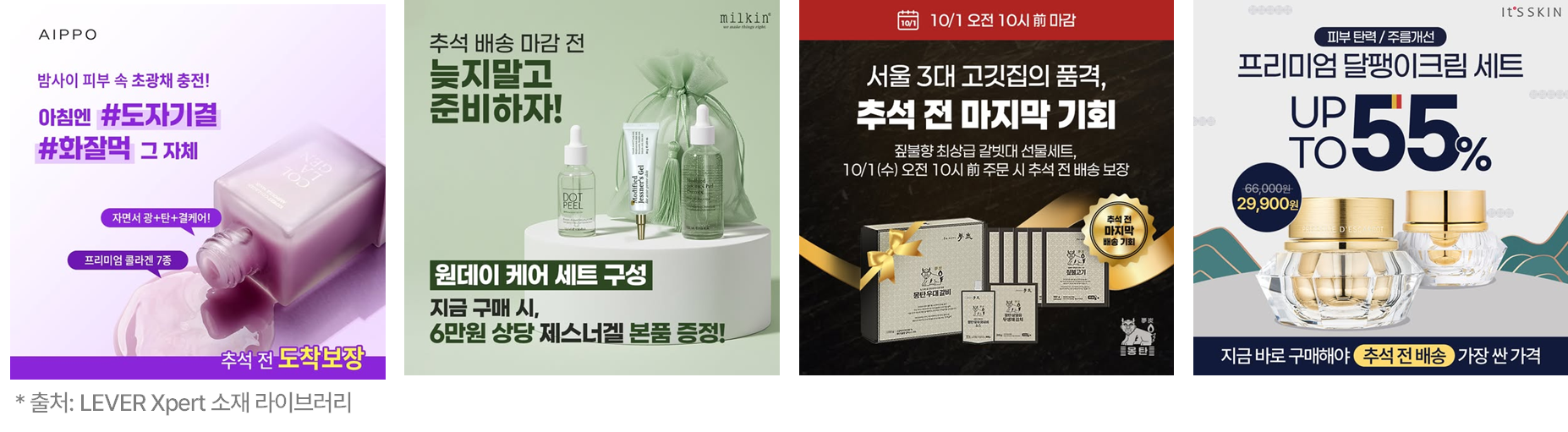 명절 분위기를 반영한 키워드와 비주얼 활용은 기본이고, 여기에 더해 배송 시점 강조 시 전환을 유도할 수 있습니다. 예를 들어, 배송 마감 D-3 / 추석 전에 받을 수 있는 마지막 기회 등 과 같은 메시지로 소비 심리를 압박하는 것이죠.이러한 메시지는 광고 뿐만 아니라 CRM 메시지에도 연계해 활용하면 더욱 효과적입니다.