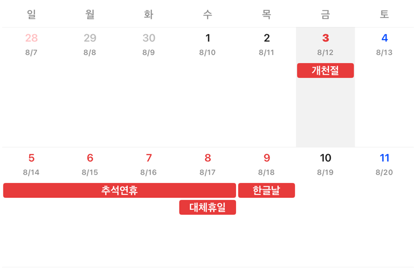 공휴일이 단 하루도 없는 9월이지만, 직장인들이 버틸 수 있는 이유는 바로 다가오는 10월 황금 연휴일 텐데요. 특히 올해는 개천절부터 주말, 추석 연휴, 대체 휴일, 그리고 한글날까지 이어지며 최대 7일의 휴식을 누릴 수 있습니다. (10월 10일까지 휴가를 확보했다면 무려 10일 연속🎉)