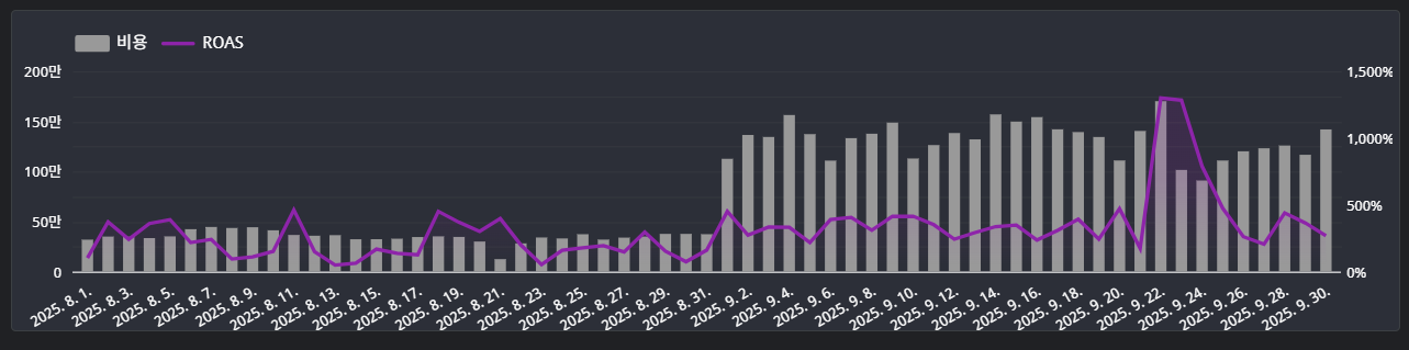 중요한 지표들은 위 예시 이미지처럼 바 차트나 라인 차트를 통해 전반적인 트렌드를 추적합니다. 특히 퍼포먼스 광고를 운영하는 브랜드 입장에서 ROAS 지표는 전체 매출에 영향을 미치는 핵심 지표이며, 상승/하락 추이를 보고 퍼포먼스 마케팅 운영 방향성을 결정하는 중요한 기준이 됩니다.