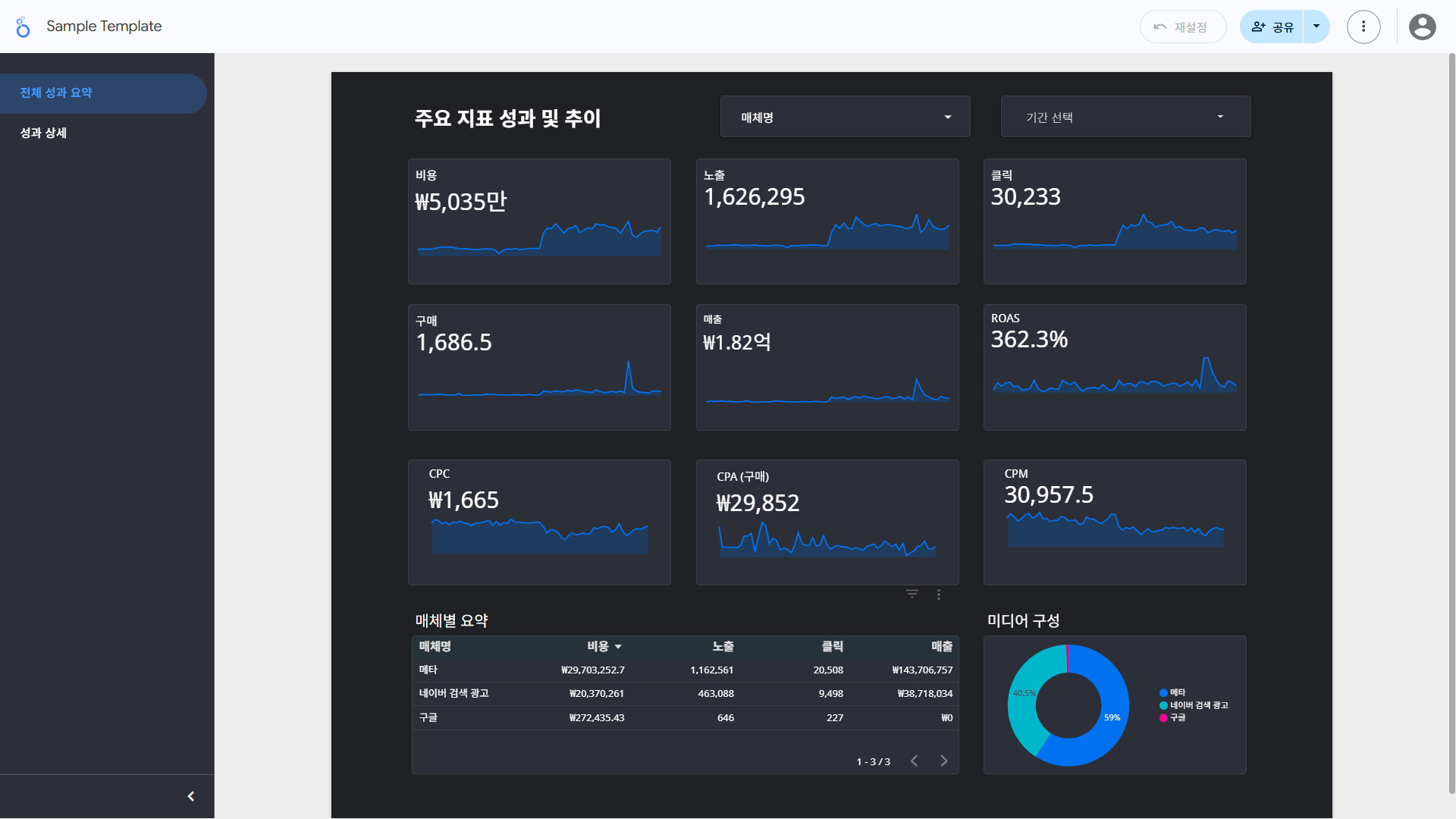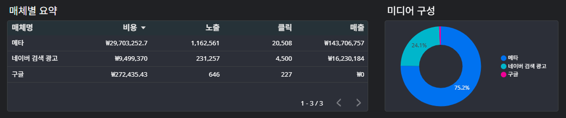 퍼포먼스 광고 운영에 있어 가장 중요한 의사결정 중 하나는 다양한 광고 매체를 어떻게 조합하여 운영할 것인가? 하는 질문인데, 이를 미디어 믹스(Media Mix)라고 하고 각 광고 매체별로 광고 성과 및 효율 지표를 볼 수 있도록 테이블을 구성합니다. 특히 루커 스튜디오 상에서는 각 매체를 클릭하여 바로 필터를 적용할 수 있으므로, 매체별 광고 성과 추이도 손쉽게 파악할 수 있습니다.