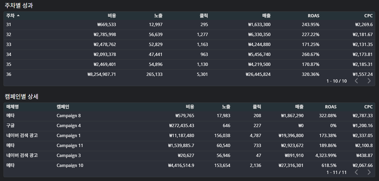 광고 성과 대시보드는 광고 성과를 한 눈에 파악하기 위해 구축합니다.