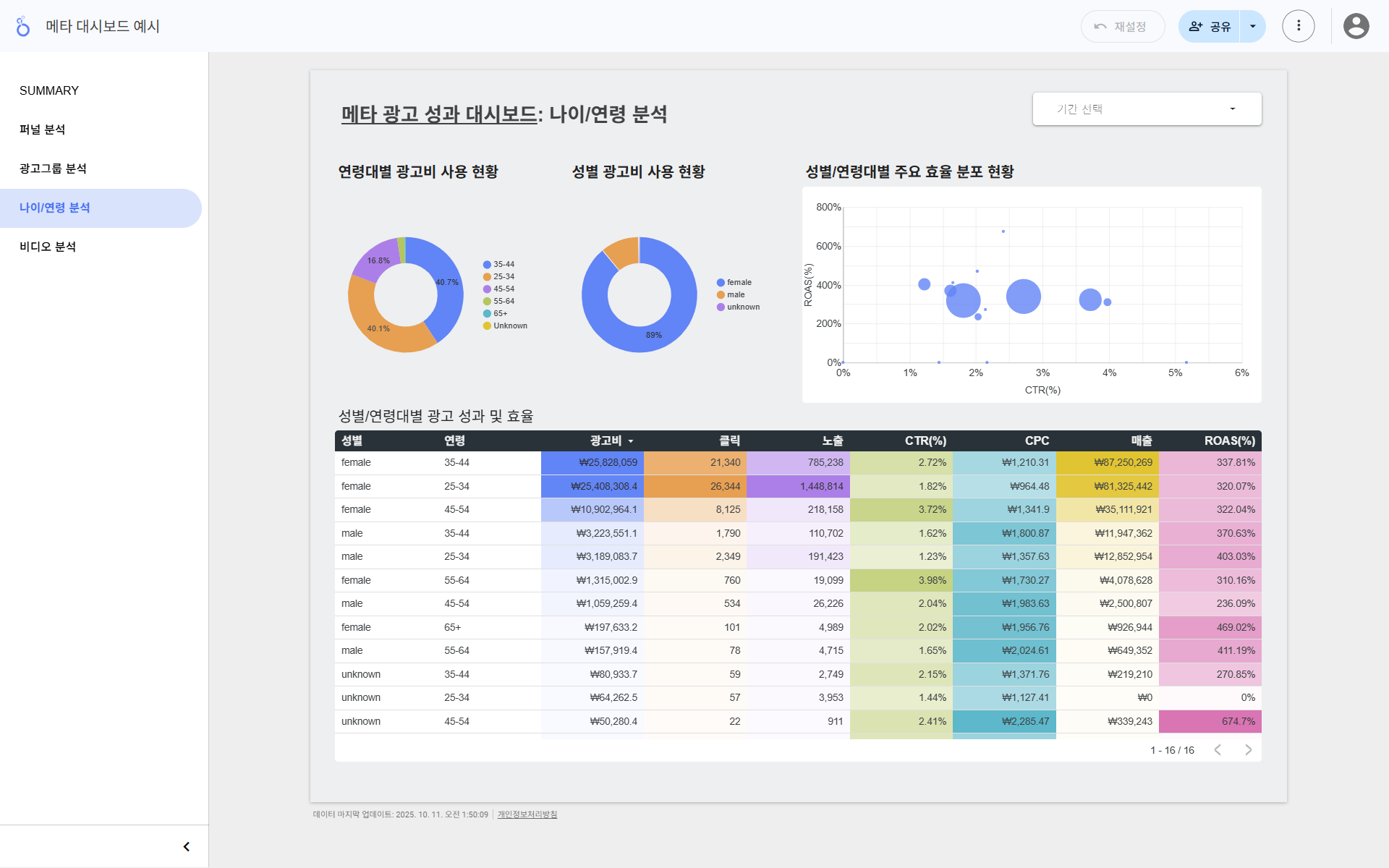나이와 성별은 고객 타게팅의 시작과 같습니다. 하단에 위치한 데이터 테이블처럼 성별과 나이에 따라 광고 효율을 비교할 수 있는데, 이를 토대로 새로운 고객군에 더 많은 광고비를 투자하는 판단을 내릴 수 있습니다.