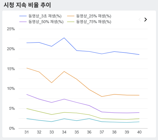 기본적으로 영상 후반부로 갈수록 시청을 지속하는 비율이 줄어드는 것은 당연하지만, 각 라인 간 간격을 통해 영상 flow의 개선 포인트를 도출할 수도 있습니다. 예를 들어 위 예시에서 31주차에는 3초 재생과 25% 재생 간 간격이 7%p 수준이었지만, 40주차에는 10%p 수준까지 벌어진 것을 확인할 수 있습니다. 영상 구성에 있어 도입부 이후 초반 단계에서 고객들을 충분히 붙잡지 못하고 있다는 것을 의미합니다.