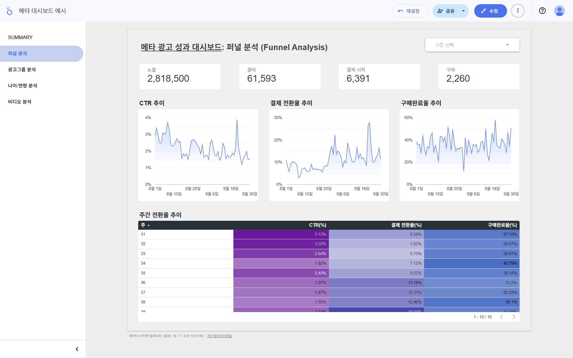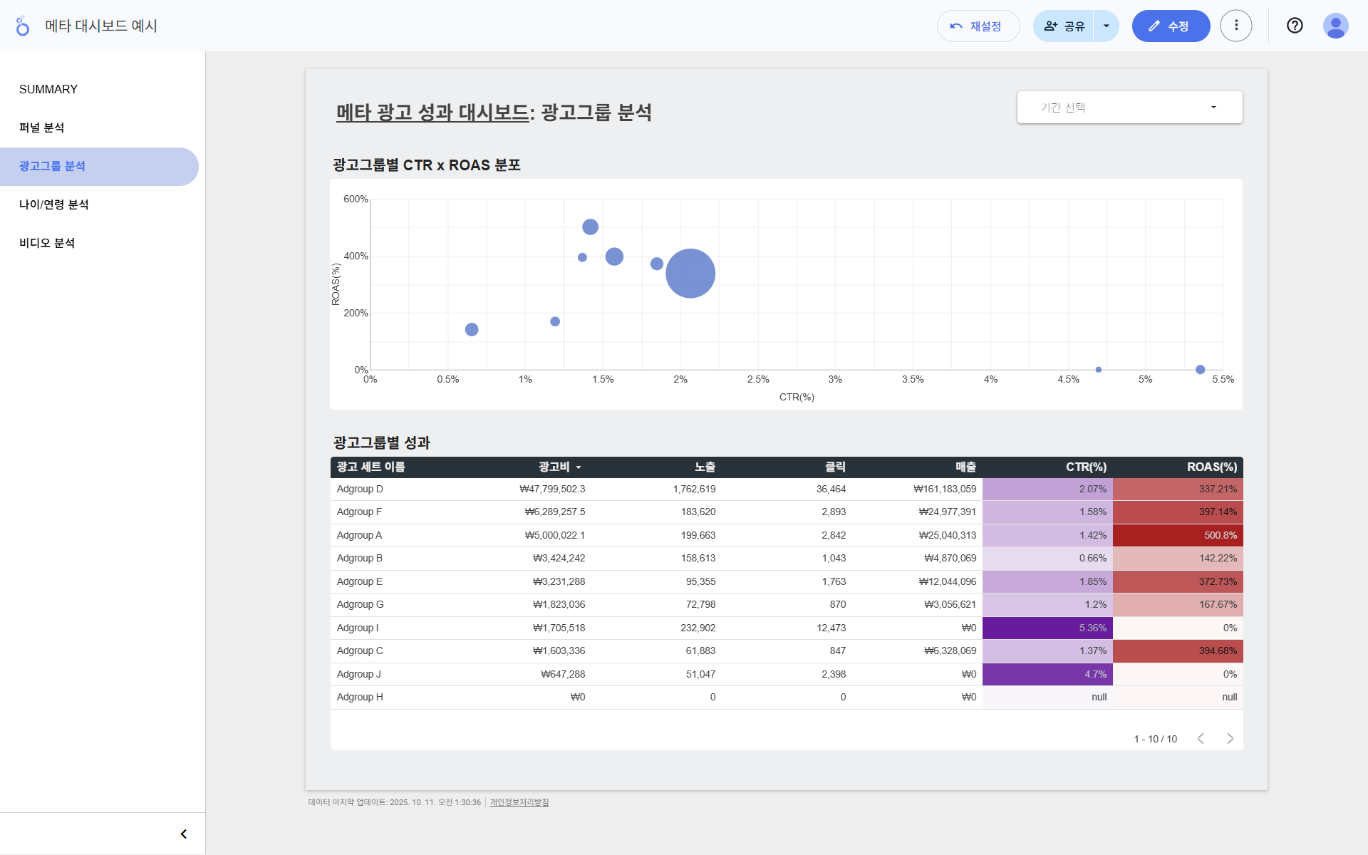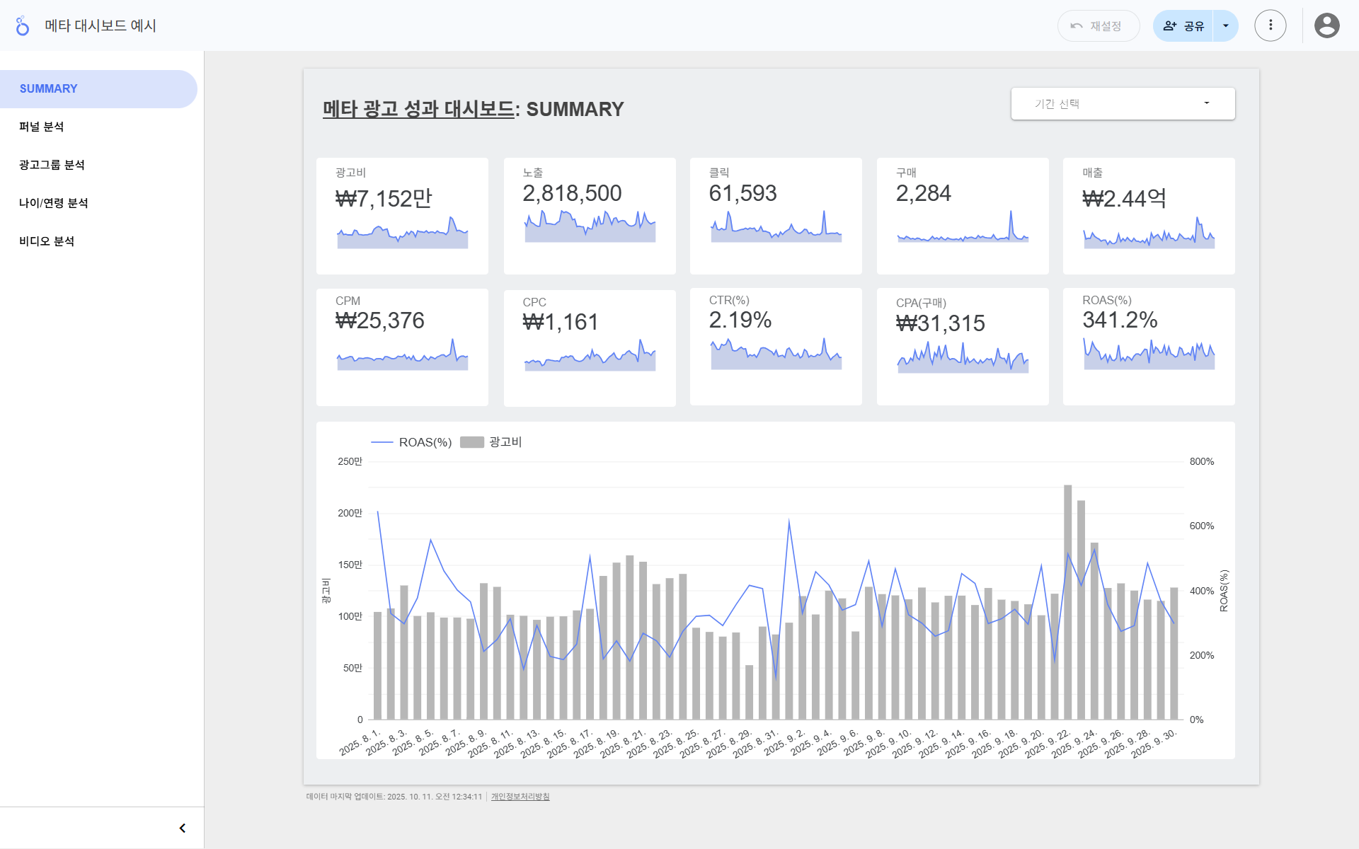 가장 기본적인 광고 성과와 효율 지표로 구성한 요약 페이지입니다..