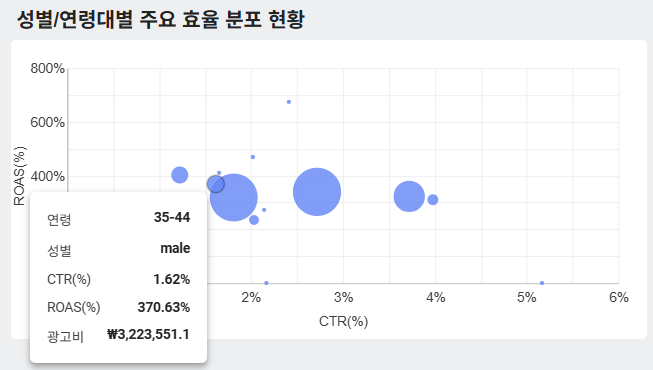 우측 상단에 위치한 버블 차트는 고객 세그먼트별 광고 효율과 사용된 광고비를 파악할 수 있는 차트입니다.