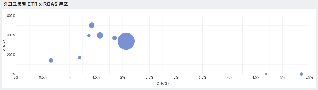 X축과 Y축에 효율 지표를 배치하게 되면 종합적으로 우수한 캠페인이나 광고그룹을 직관적으로 파악할 수 있는데, 이 때 광고비를 의미하는 버블 사이즈를 통해 우수한 캠페인 or 광고그룹에 적합하게 광고비를 사용했는지를 판단할 수 있습니다. 만약 좌하단에 위치한 버블 사이즈가 크다면 효율이 낮은 캠페인 or 광고그룹에 많은 광고비가 지출됐음을 시각적으로 빠르게 판단할 수 있습니다.