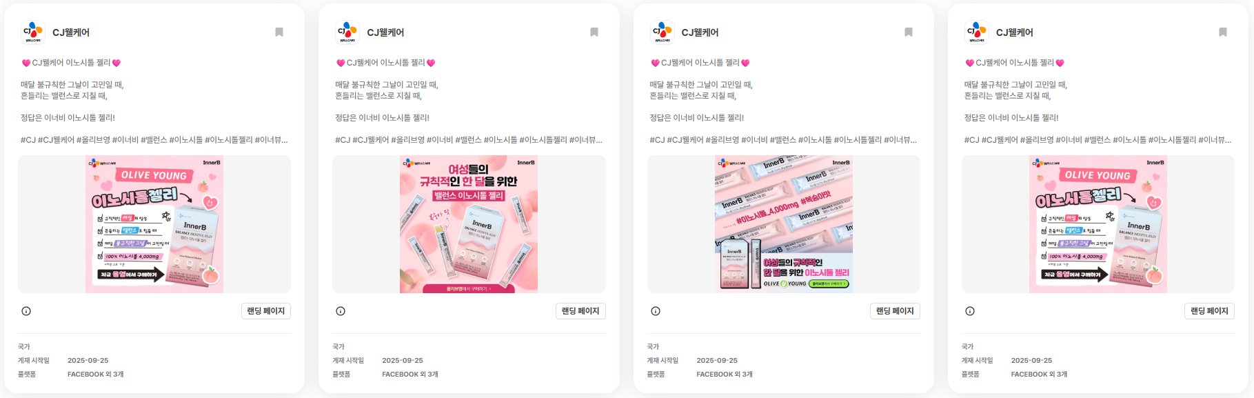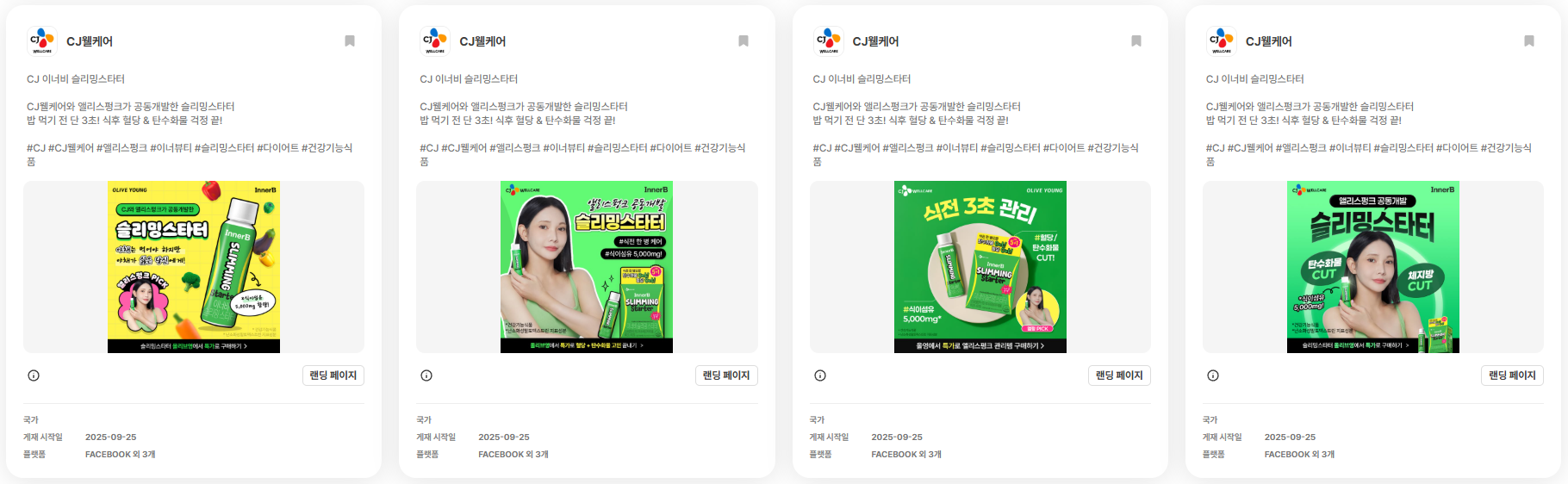 브랜드 아이덴티티를 담은 일관된 포맷으로 운영하기보다는, 생성형 AI를 활용하여 만든 영상형 광고 등 다양한 형태의 소재를 운영하고 있는 것으로 보입니다.