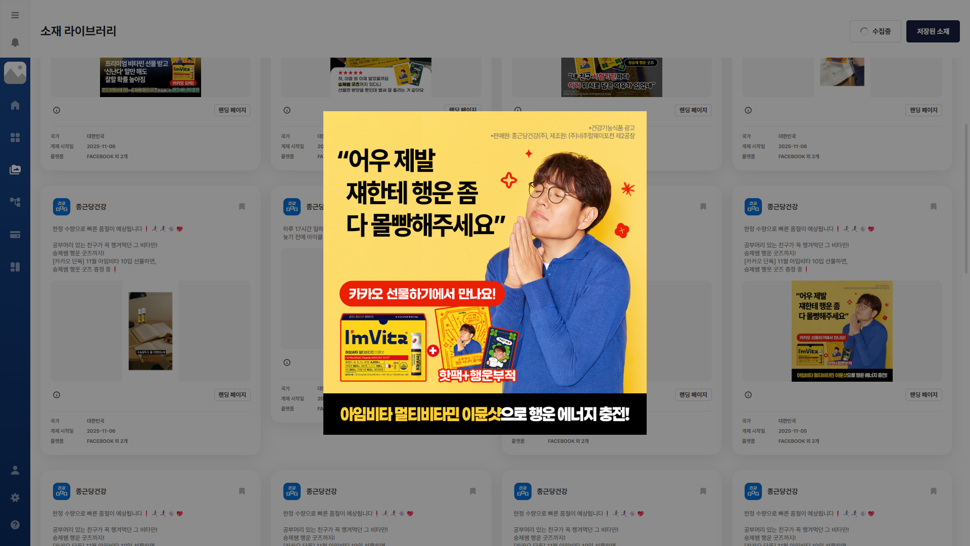 종근당건강의 광고 소재들을 예로 들면 11월에는 종근당건강의 주력 라인업 중 하나인 멀티비타민 이뮨산 아임비타의 신규 소재들이 많이 올라오고 있고, 인강 강사인 정승제 선생님을 모델로 활용하고 있는 점을 알 수 있습니다. 아임비타의 타겟 고객 세그먼트 중 하나인 고등학생향으로 소구점을 전달하고 있죠. 특히 2026학년도 대학수능능력시험이 11월 13일인 것에 맞추어 행운부적 등을 강조한 점이 눈에 띕니다.