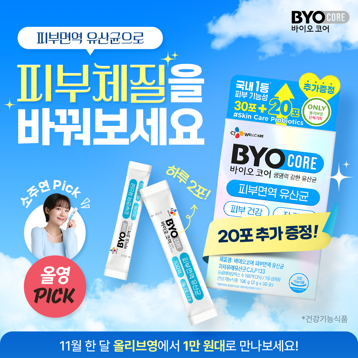 CJ웰케어의 주력 제품인 바이오코어의 광고 소재는 소주연 배우를 소재에 활용하고 있고, 전반적으로 파란색 톤을 유지하고 있습니다. 소재 이미지 하단에 띠 형태의 카피를 담은 이미지가 많아 보이고, 11월 소재의 경우 12,100원이라는 가격적인 소구점을 강조하고 있습니다.