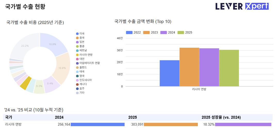 연도별 수출 금액 추이를 보게되면 2023년 급성장하여 2024년에는 성장이 잠시 둔화되었으나, 2025년 10월 누적 기준으로 전년 대비 18% 성장하여 이미 2024년 전체에 준하는 수출 금액을 기록하고 있습니다.