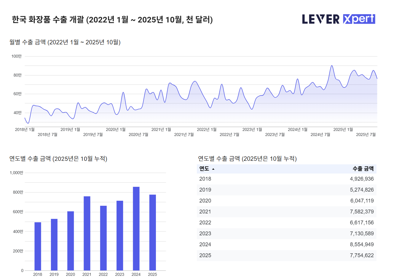 한국 화장품 수출 현황 및 추이 대시보드 배포 (10월 업데이트)