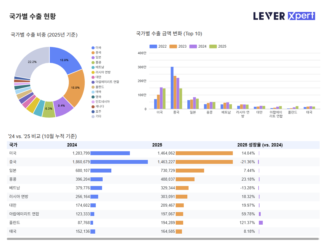 엑스퍼트 팀은 지속적으로 관세청 수출입 무역 통계 데이터를 추적하여, 고객사들의 글로벌 확장 전략에 활용하실 수 있도록 지원할 예정입니다.