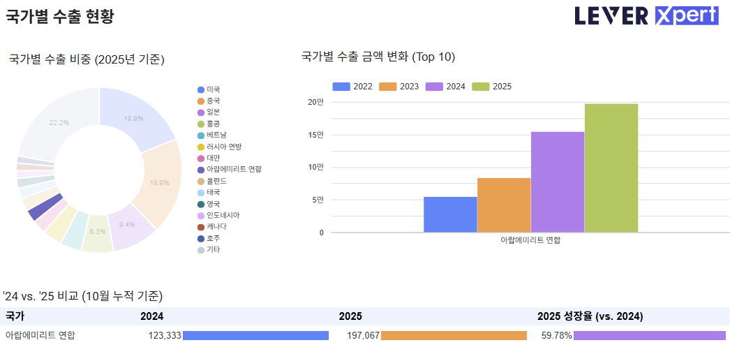 지난 글에서 폴란드향 수출이 빠르게 성장하고 있는 부분에 대해서 다루었는데요, 아랍에미리트 연합(UAE) 역시 놀라운 성장을 보여주고 있는 국가 중 하나입니다. 2025년 10월까지의 수출 금액만으로 2024년 전체 수출 금액을 상회하고 있고, 동기간을 비교한다면 60%에 달하는 성장률을 기록하고 있습니다.