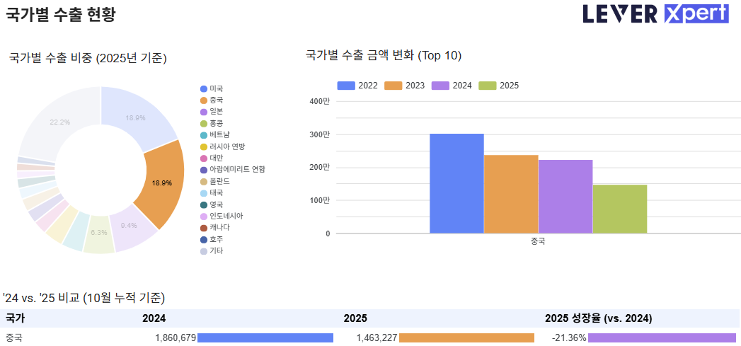 기존 1위 수출국이었던 중국은 2025년 미국에 그 자리를 내주었는데요, 고점을 기록했던 2021년 이후 지속 하락하고 있는 추세이며 2025년에도 하락 추이는 여전해 보입니다.